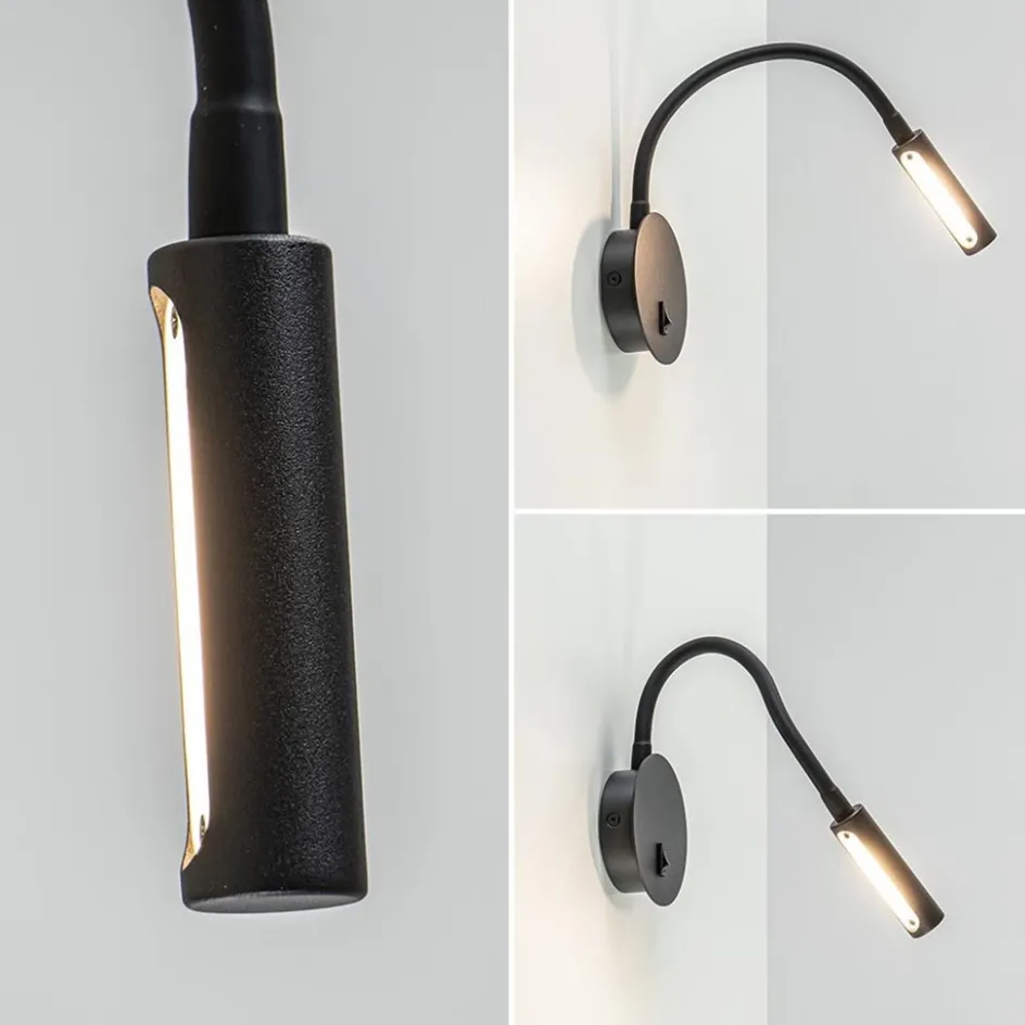 Een perfect lampje voor naast uw bed. De kleine wandlamp is gemaakt van metaal en uitgevoerd in het zwart. Dit geeft het wandlampje een moderne look. Ideaal aan de zwarte wandlamp is dat deze is voorzien van een flexibele arm zodat u gemakkelijk de arm kunt verstellen. Erg handig wanneer u voor het slapen nog even wilt lezen. De verstelbare wandlamp is verder voorzien van geïntegreerd LED en heeft een schakelaar op de ronde bevestiging. De moderne wandlamp is niet voorzien van een snoer en dient dan ook direct op een stroompunt te worden aangesloten.